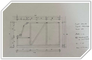 Die Firma Holzbau Zwatz stellte dankenswerterweise Konstruktionslatten, Bretter und Schrauben zur Verfügung, mit denen das Grundgestell zusammengebaut werden konnte. Um Stauraum zu gewinnen, wurden auf der rechten Seite des Wagens Schubladen eingebaut. Eine Autobatterie sorgt für die Stromversorgung der Signalleuchten und des Folgetonhorns.