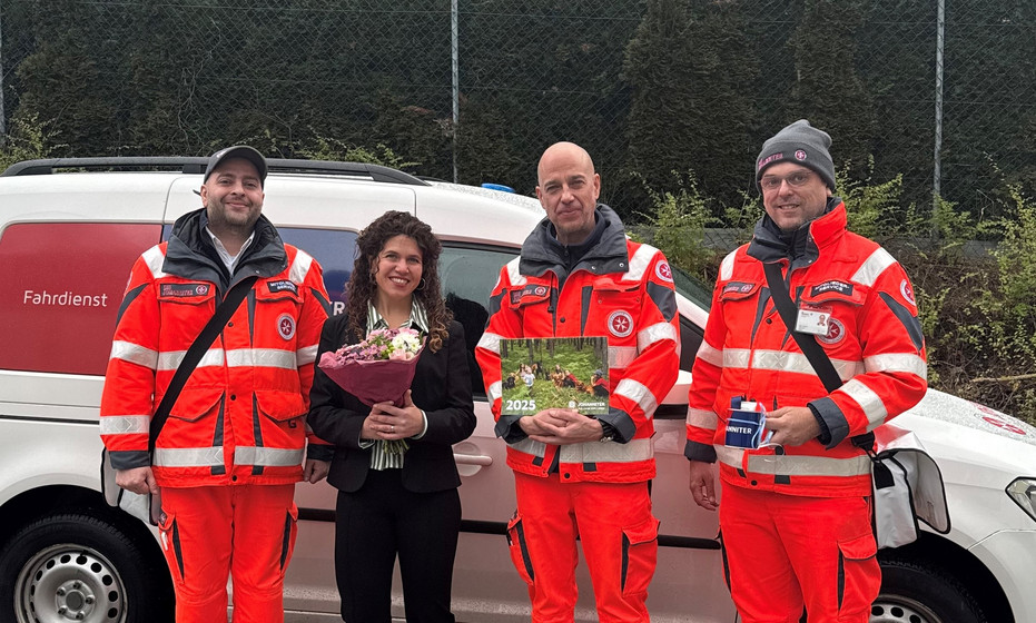 Als kleines Dankeschön hat das Fundraiser-Team der Johanniter Amy mit einigen Mitbringseln überrascht: Mit dem Kalender der Johanniter Rettungshundestaffel, einer Johanniter-Tasse mit allerlei Kleinigkeiten darin und nicht zuletzt einem Blumenstrauß.