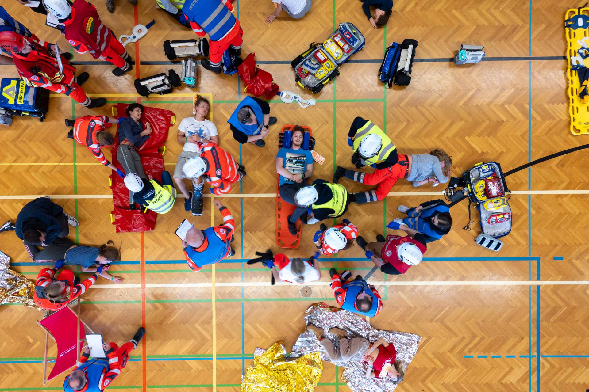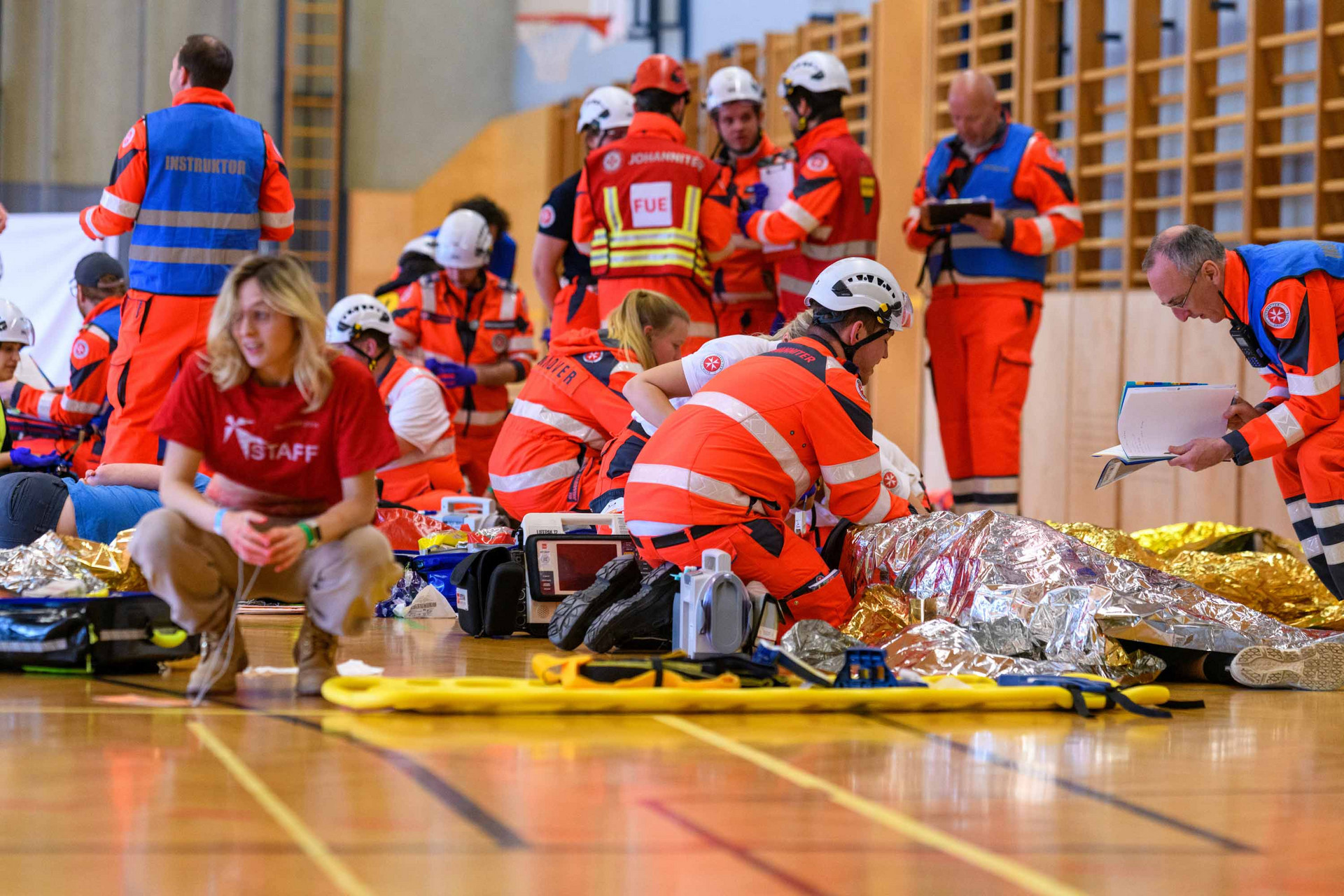 Insgesamt wurden in einer Schule vier Großschadenslagen simuliert. Die teilnehmenden Sanitäter:innen arbeiteten Hand in Hand mit Notärzt:innen in Ausbildung, die im Rahmen ihres Abschlusskurses der Notarztausbildung vor Ort waren. Parallel zu den Szenarien erhielten einige Teilnehmende Gelegenheit, sich im Rahmen von Probeprüfungen und Szenarientrainings weiter vorzubereiten. Die Simulationen wurden durch Laiendarsteller:innen unterstützt, die realitätsnahe Notfallbilder ermöglichten.