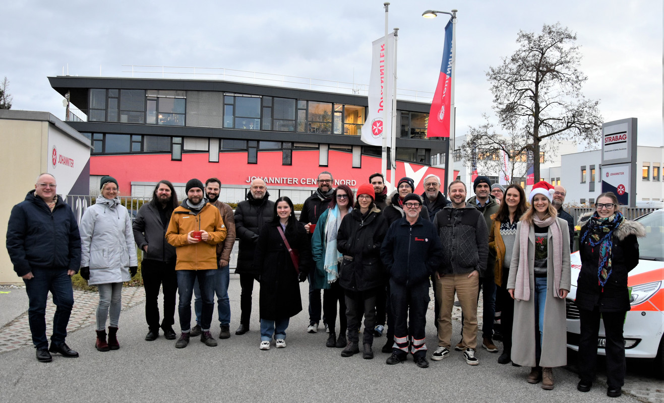 Wie bereits im Sommer wurde eine öffentliche Veranstaltung auf dem Parkplatz der Ignaz-Köck-Straße 23 gegenüber des Johanniter Center Nord simuliert und zahlreiche Teilnehmer:innen stellten eine Reihe von kritischen Situationen, die von einem Kreislaufkollaps bis hin zu einer Schlägerei reichten. Alle Szenen wurden mit mehreren Kameras aus verschiedenen Blickwinkeln gefilmt und zur weiteren Bearbeitung aufgezeichnet.