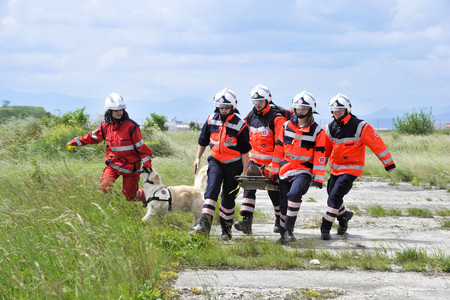 Der Rettungshund hat eine Vermisste gefunden, die Hundeführerin führt die Erstversorgung der Verletzten durch.