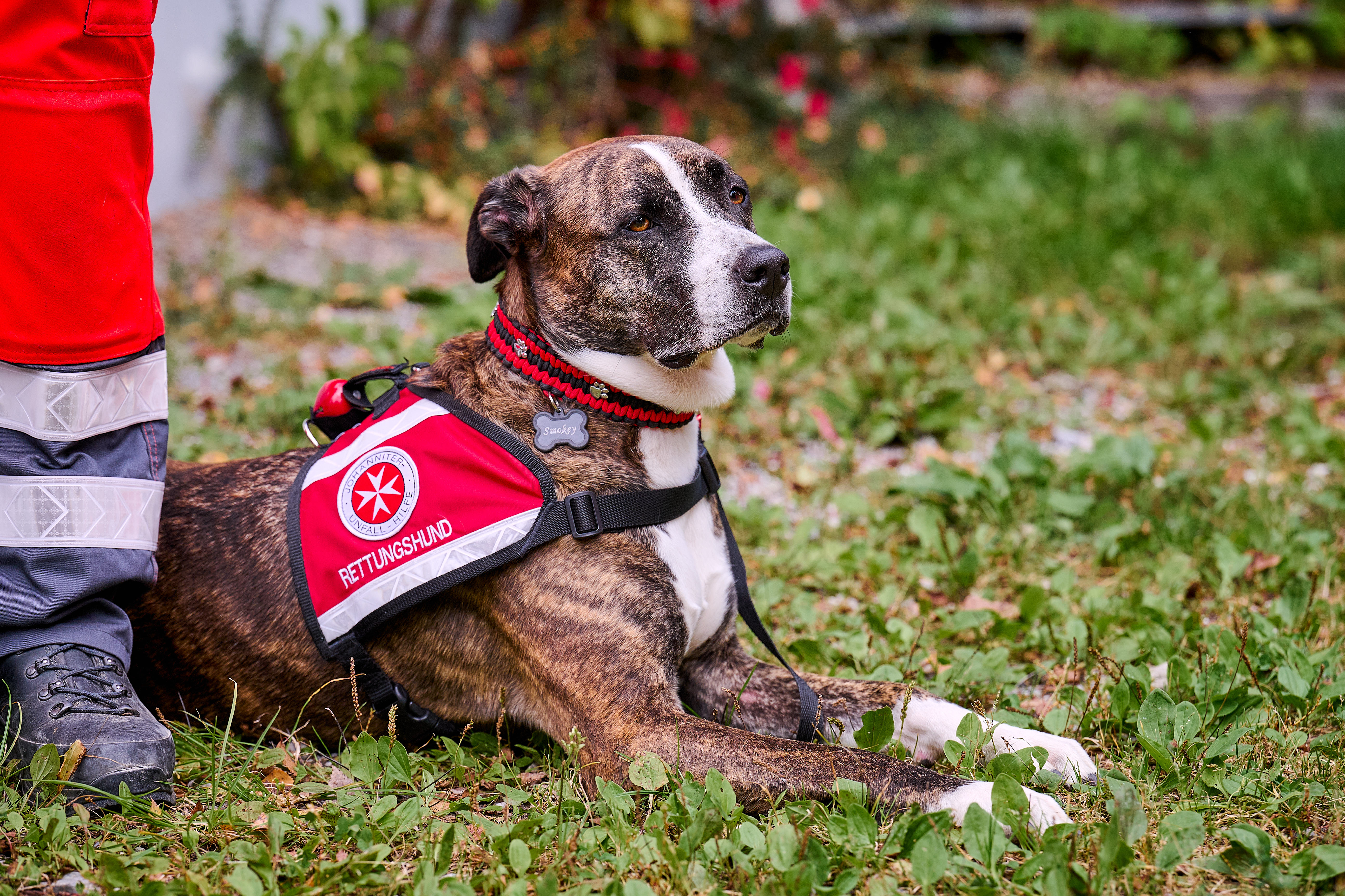 Der Rettungshund hat eine Vermisste gefunden und macht auf sich aufmerksam. Er bellt so lange, bis eine Helfer:in eintrifft.
