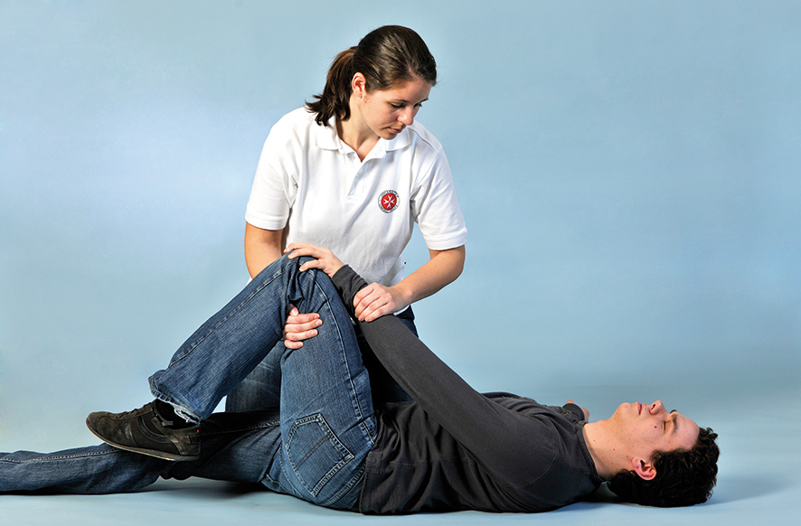 - Winkeln Sie das entfernt liegende Bein ab. Legen Sie die entfernt liegende Hand der bewusstlosen Person auf deren Knie.