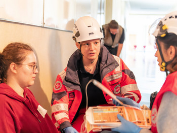 Teilnehmende der Ausbildung zum/zur Notärzt:in an der Medizinischen Universität Wien nehmen an einer Großschadensübung des Katastrophenhilfsdienstes der Johanniter teil. Diese Übung in Laa an der Thaya soll die zukünftigen Notärzt:innen auf außergewöhnliche Einsätze vorbereiten.