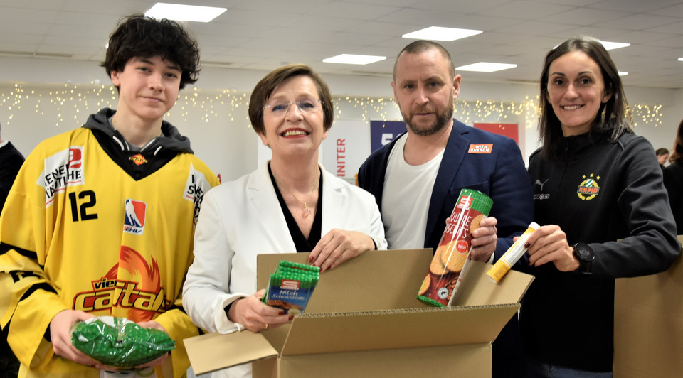 Heute kam Doris Schmidauer, Gattin von Bundespräsident Van der Bellen, zur Johanniter-Packstation, um Pakete zu befüllen. Unterstützt wurde sie dabei von Rapid-Geschäftsführer Steffen Hofmann, der Trainerin des Rapid-Damenteams Katja Gürtler, dem Palmers-CEO Janis Jung, der SPAR-Regionaldirektorin Renate Rödig und U18-Spielern der Spusu Vienna Capitals. Binnen kürzester Zeit konnten 100 Pakete befüllt werden.
